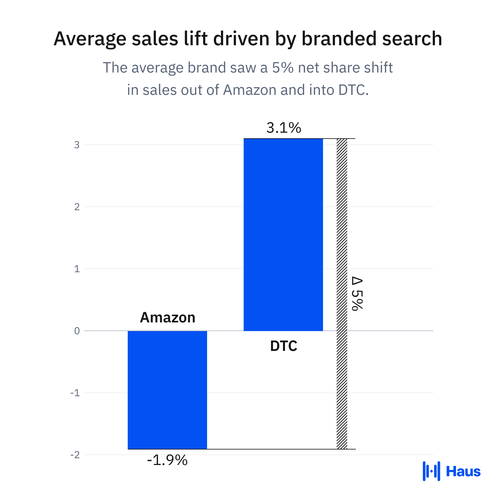 When you factor in an average DTC lift of +3.1%, the net result of branded search is a share shift of approximately 5% away from Amazon and into DTC for these brands. Depending on your unit economics, this is either a good thing or a bad thing; if youâre a brand using Fulfillment by Amazon, for example, the share shift towards DTC might not be as welcome.Â