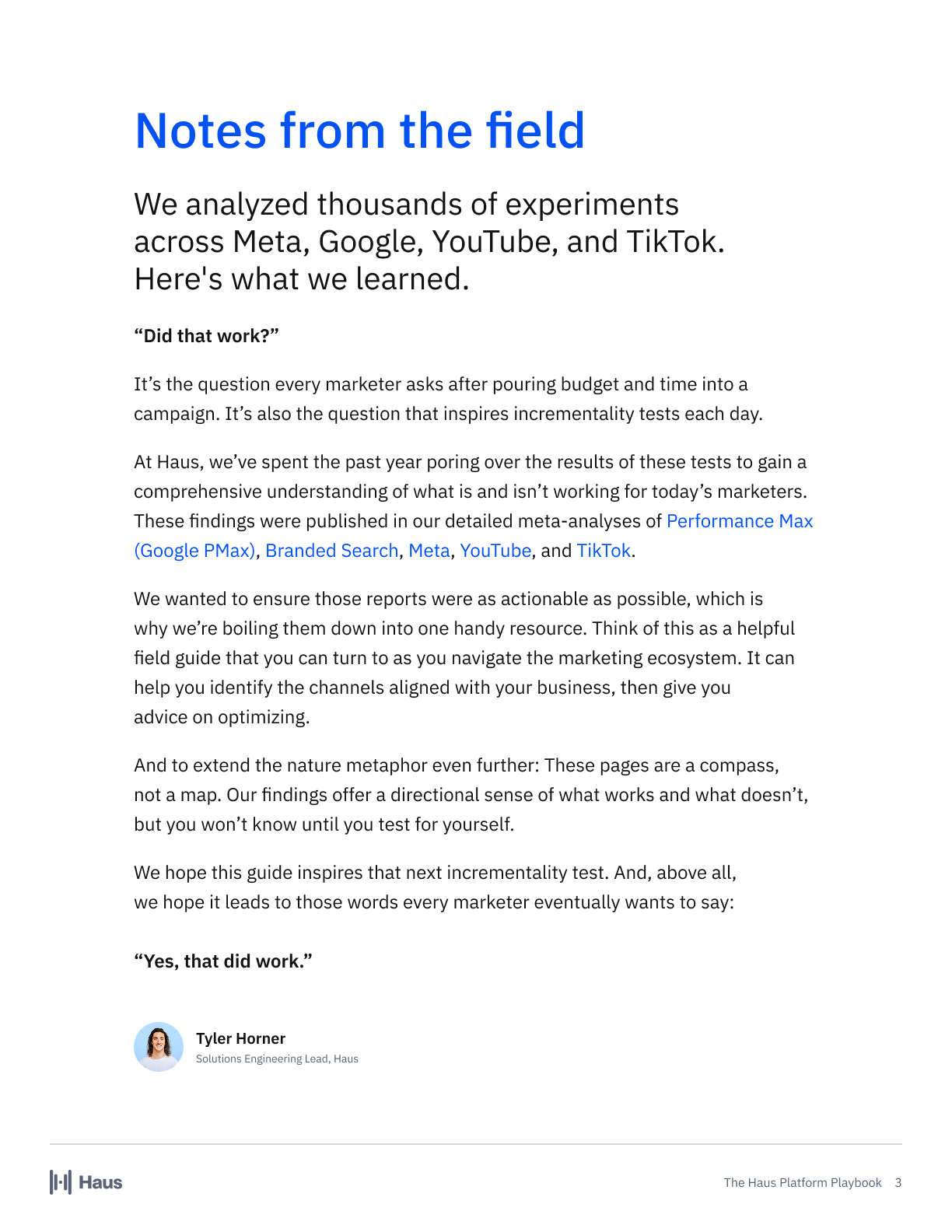 The Haus Platform Playbook distills five of our channel-level meta-analyses into one actionable guide for modern marketers. You’ll find exclusive data from our studies of Meta, YouTube, PMax, Branded Search, and TikTok, plus tactical advice for turning these numbers into action.